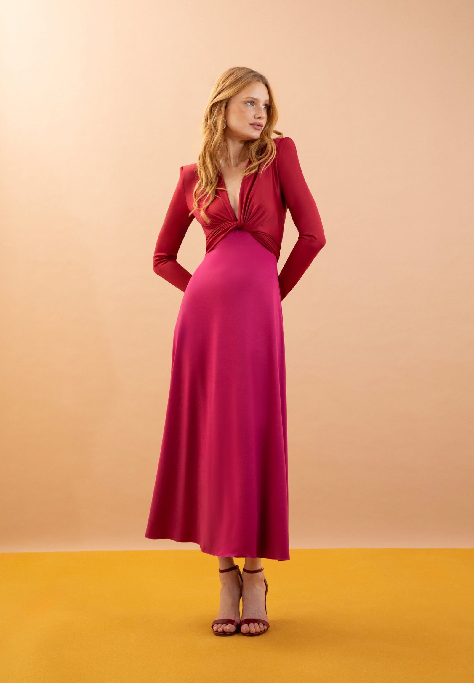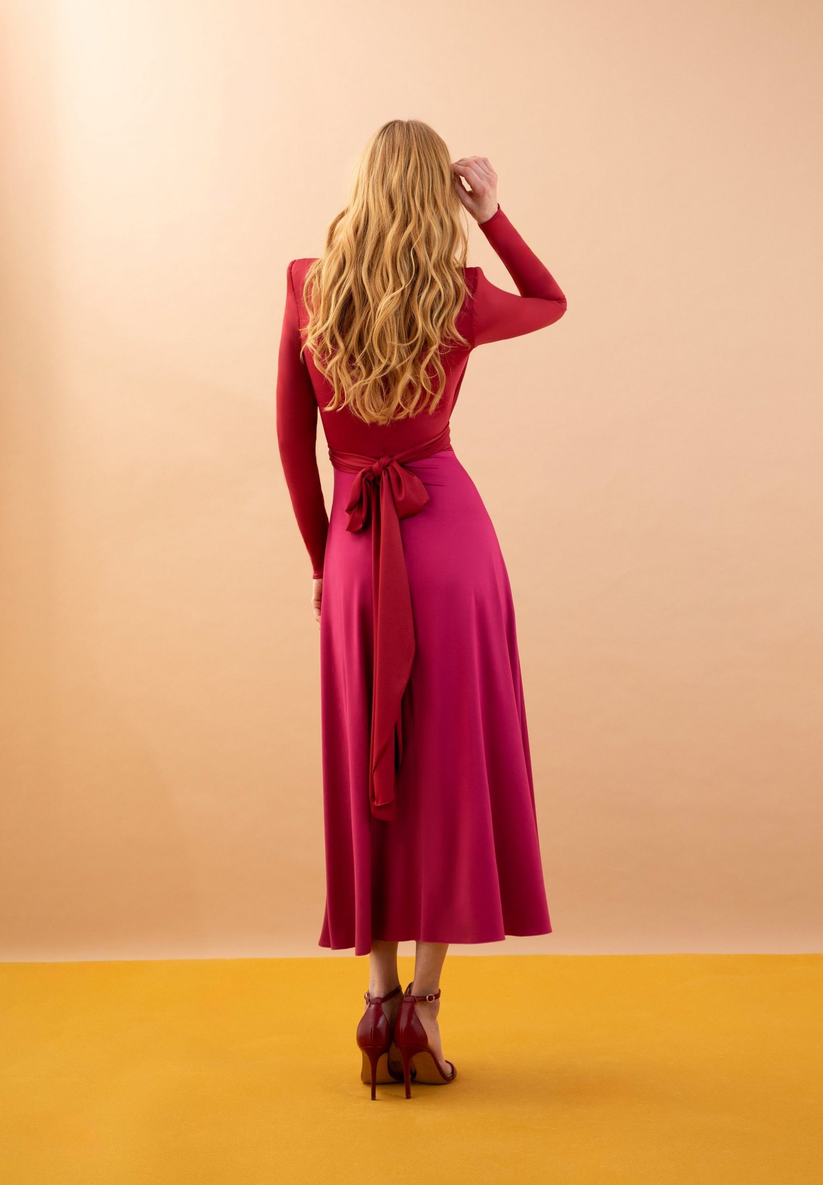 Vestido midi de punto bicolor con escote pico que cruza en el delantero y anuda en la parte trasera. Falda de capa.