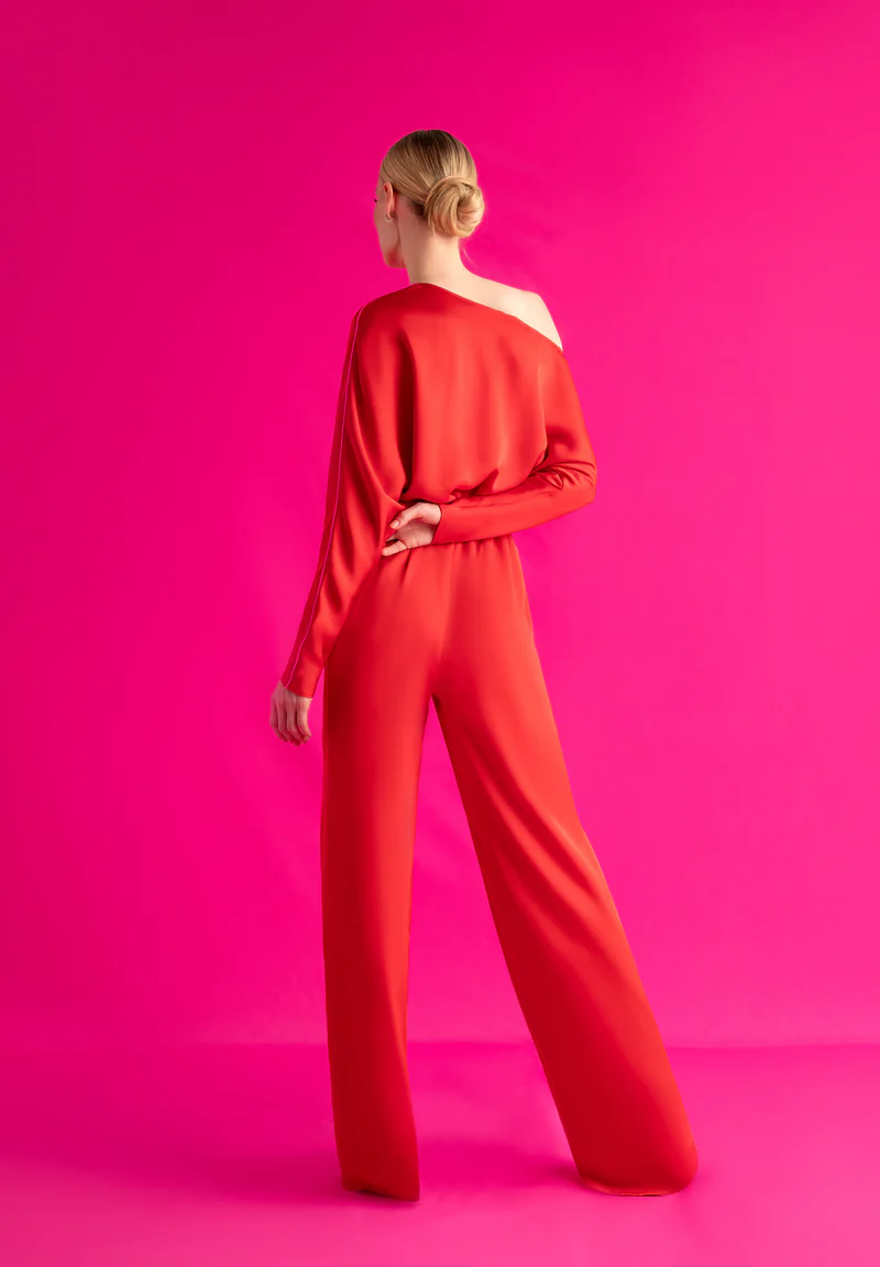 Mono asimétrico en satén con mangas murciélagos que dejan al descubierto el hombro derecho. Corte en la cintura con cuerpo ablusado y pantalón recto.  Cinturón del mismo tejido. Vivos que salen de las costuras de forma decorativa que juega con el color.