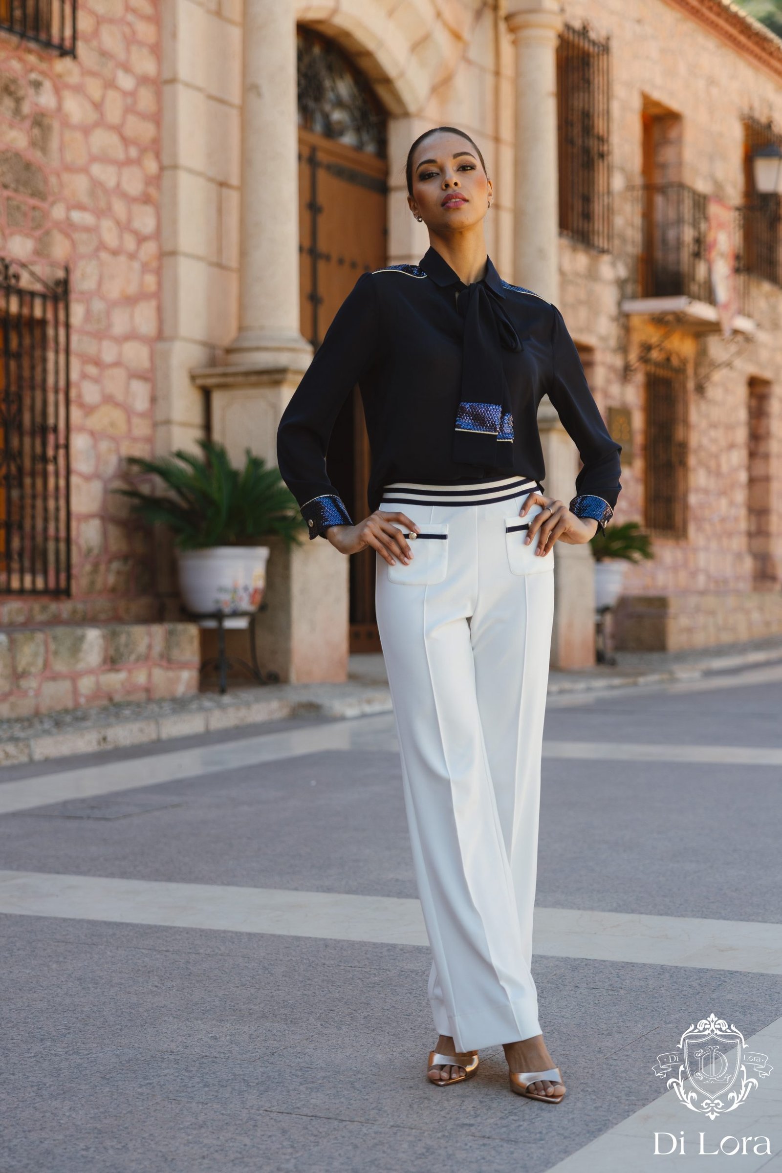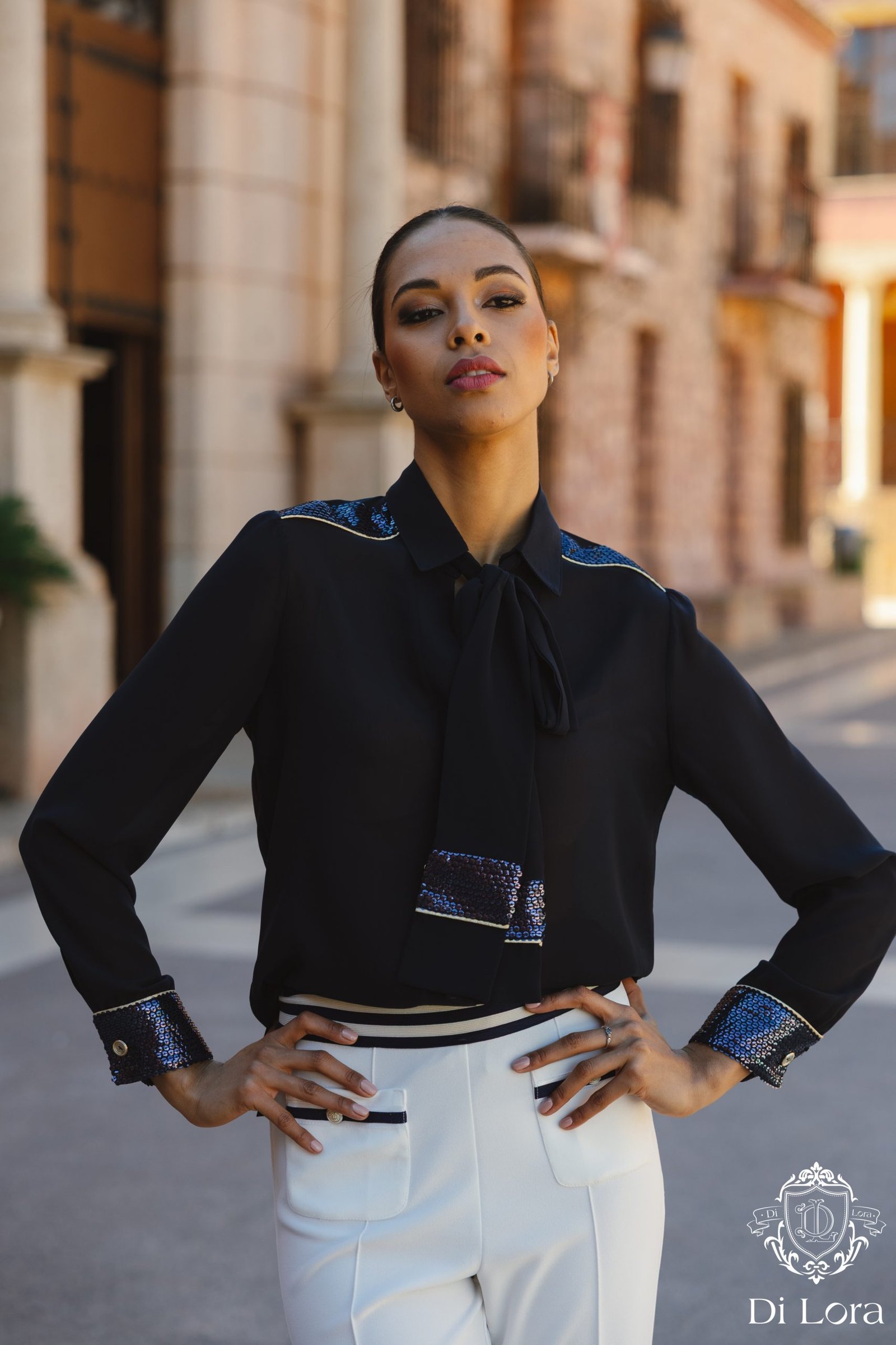Camisa de seda natural y detalles de lentejuelas en hombros y puños.