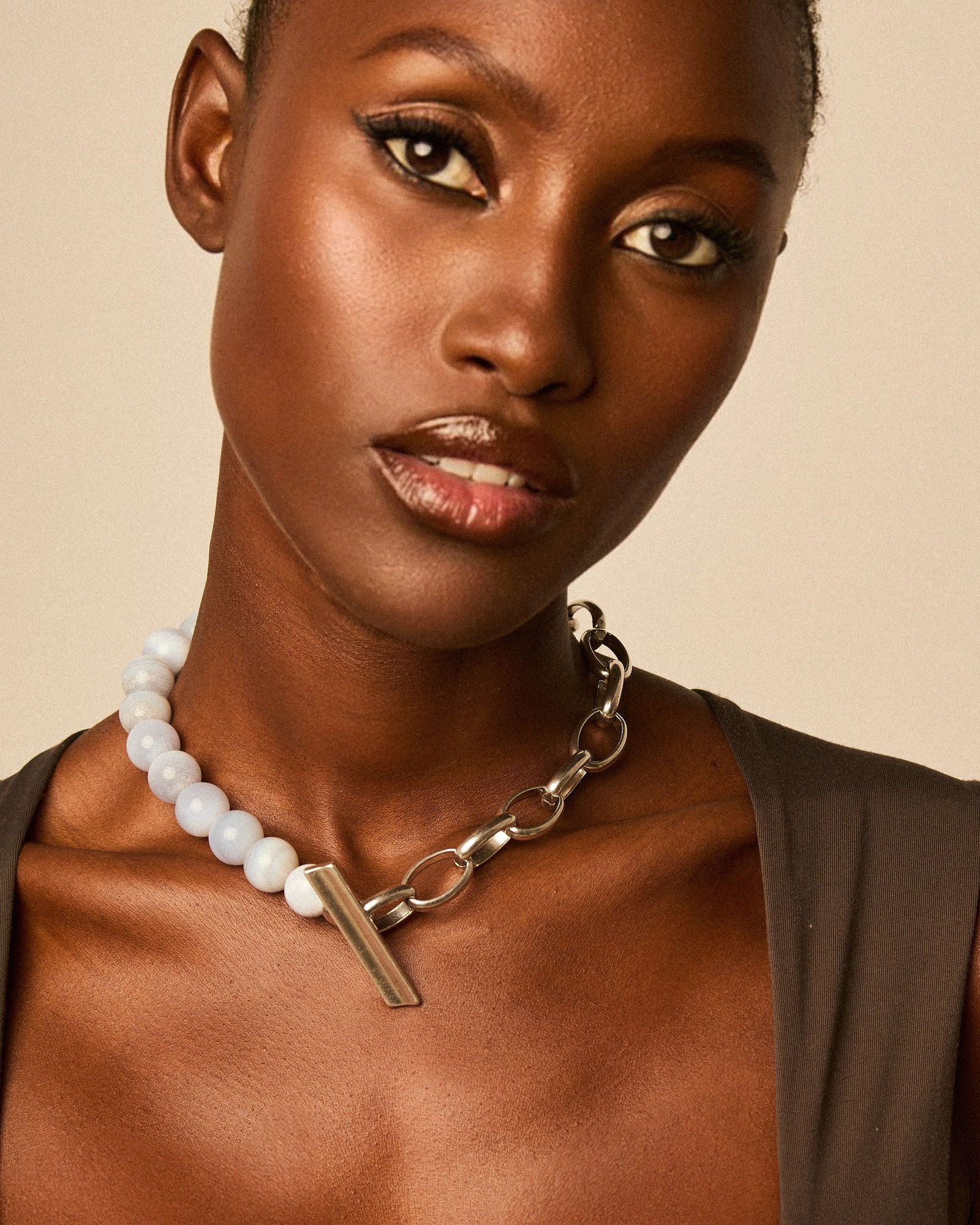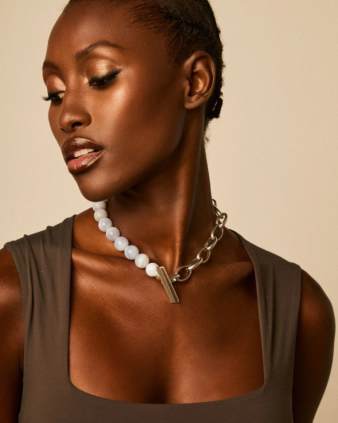 Collar corto elaborado con una combinación de cuentas de piedras semipreciosas y cadena.