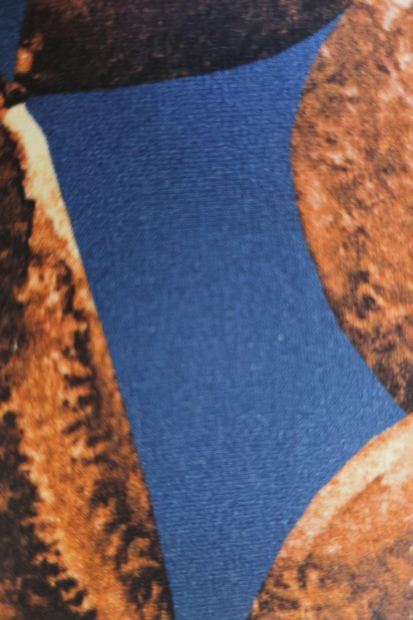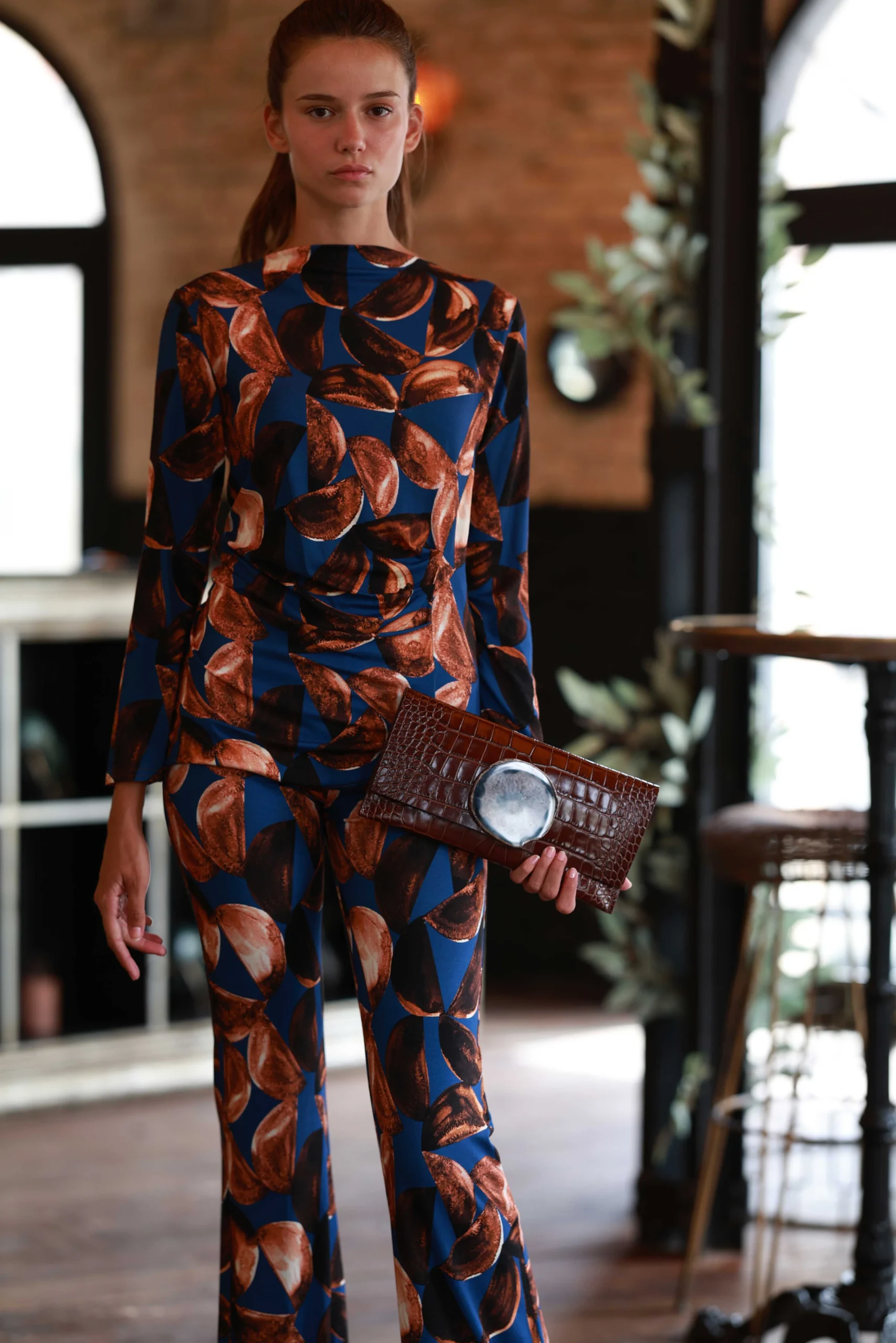 Una estampado en tonos azul y marrón, los colores de esta temporada. Se puede llevar con un cualquier top marrón, o con el top del mismo estampado para un total look rompedor.