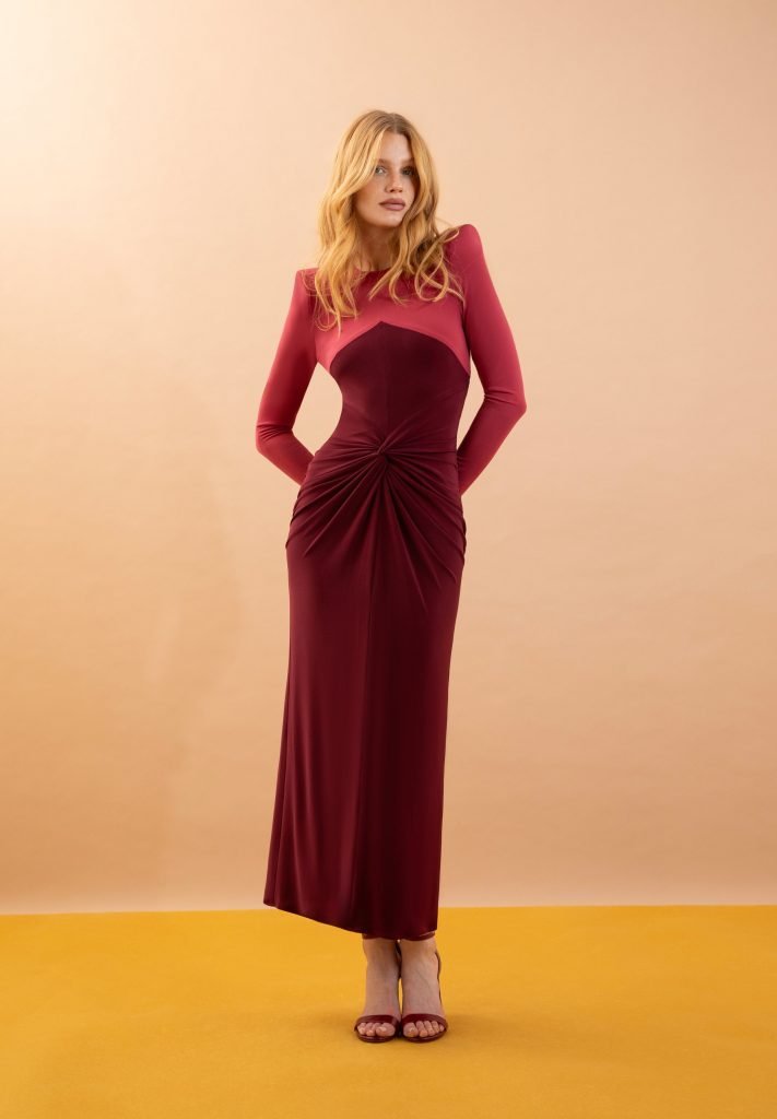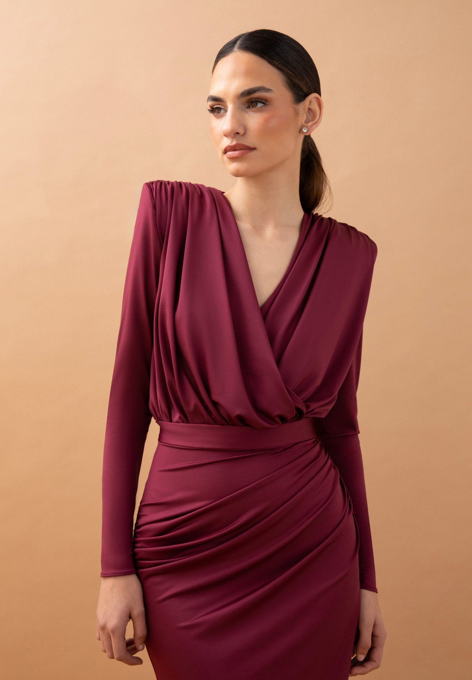 Body ablusado de punto con manga larga y hombros marcados. Cuerpo drapeado que cruza en el delantero.