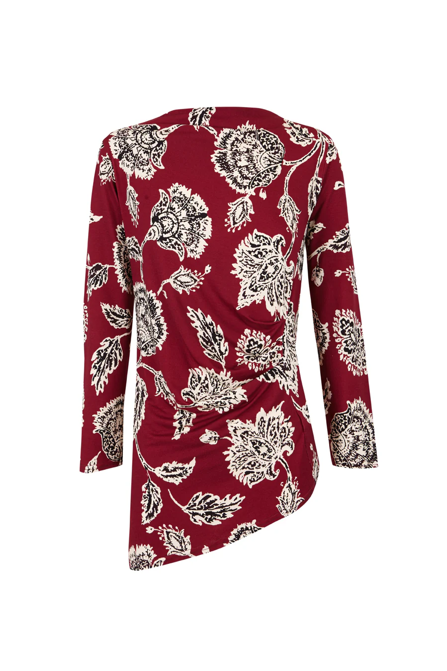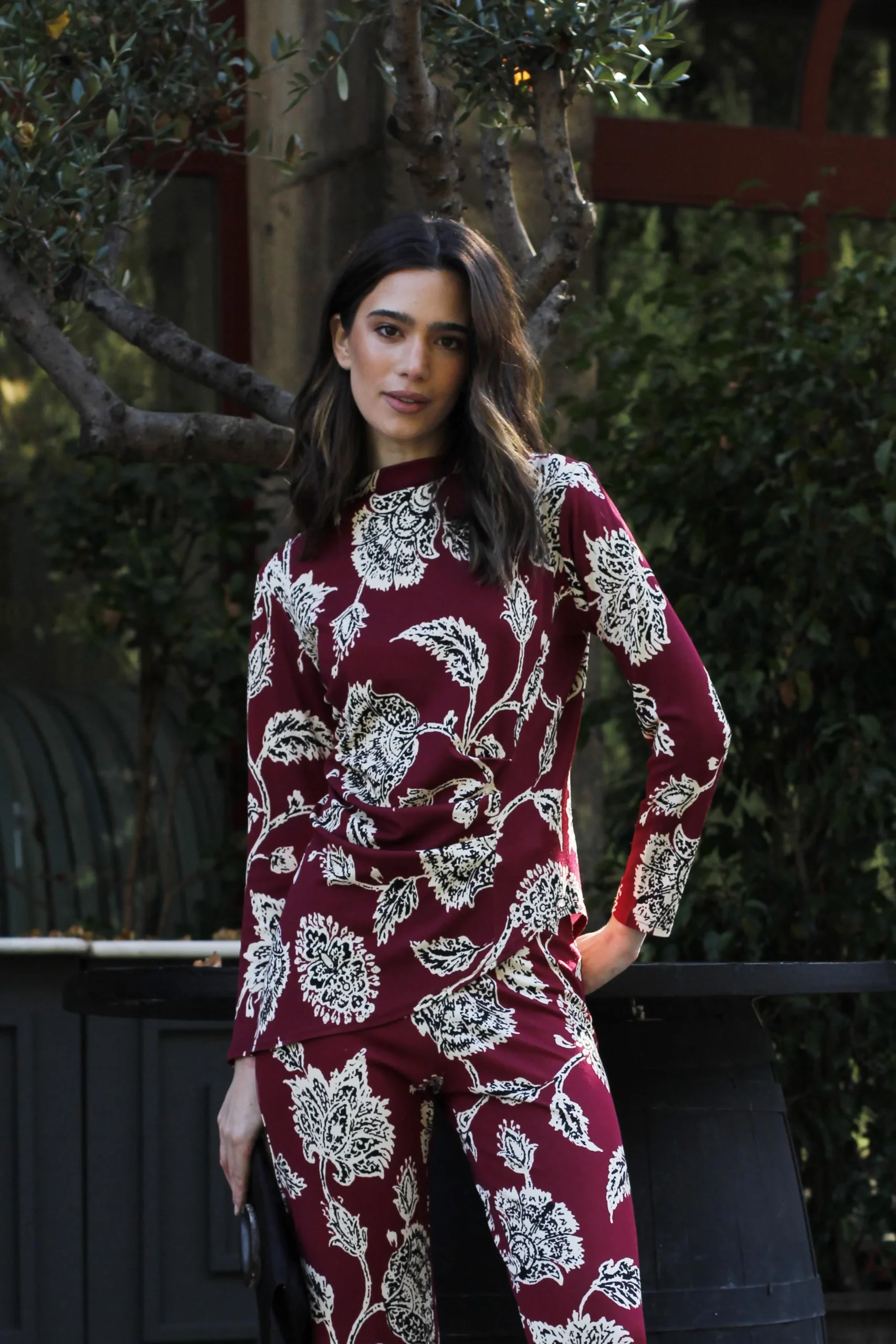 Una top de corte asimétrico en burdeos negro y beige. Se puede llevar con un pantalón negro o con el pantalón Begonia del mismo estampado para un total look más rompedor.