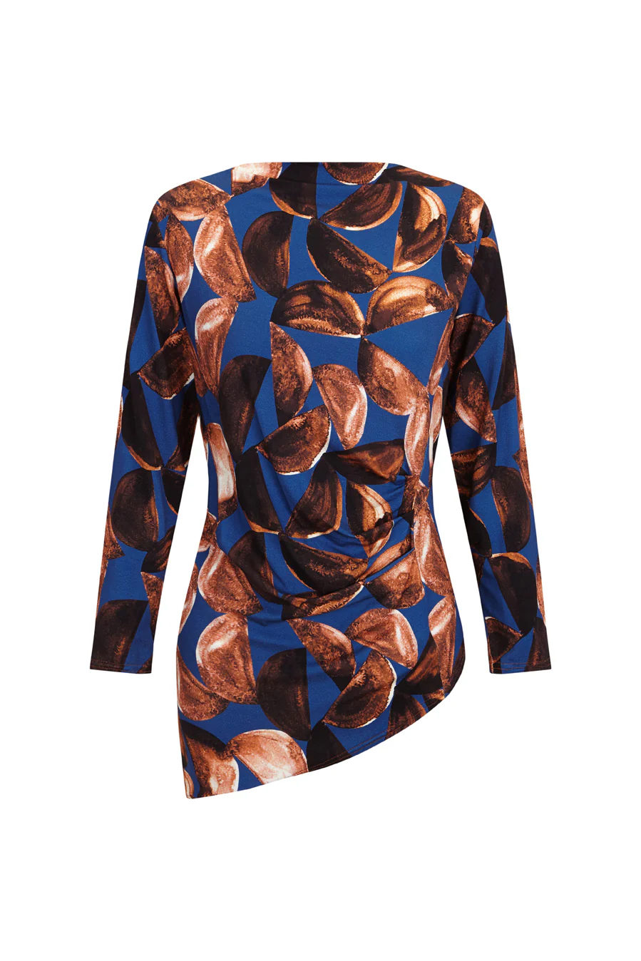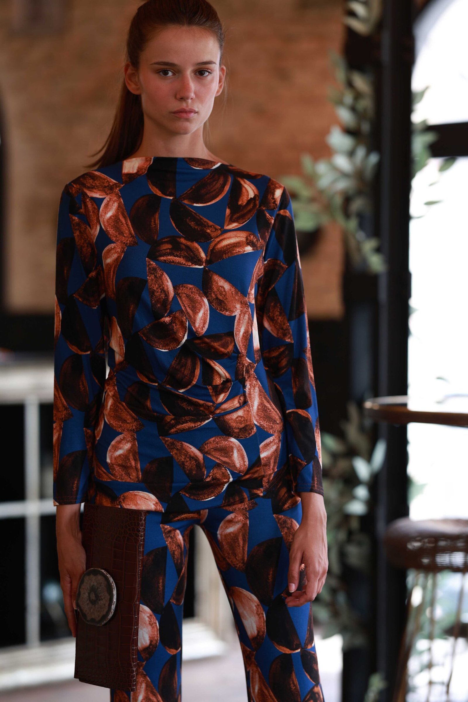 Una top de corte asimétrico en azul y marrón, los colores de la temporada. Se puede llevar con un pantalón marrón o con el pantalón Petunia del mismo estampado para un total look más rompedor.