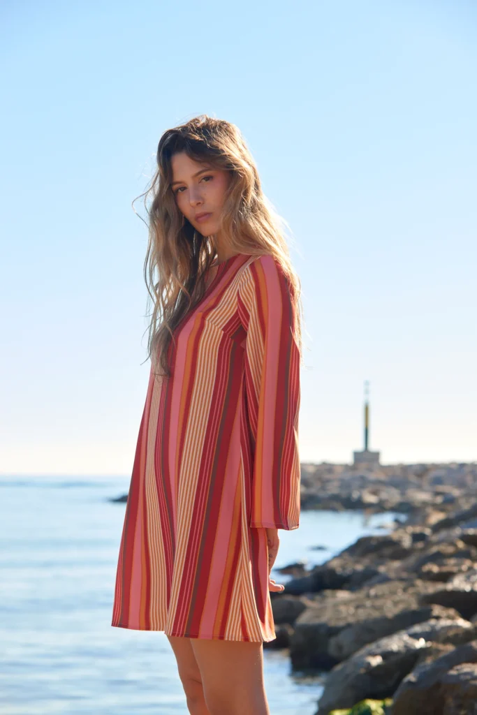 Si buscas un vestido básico pero con ese toque especial este es tu vestido, tiene un corte recto con una ligera forma evasé en el bajo, manga acampanada y un estampado corbatero.